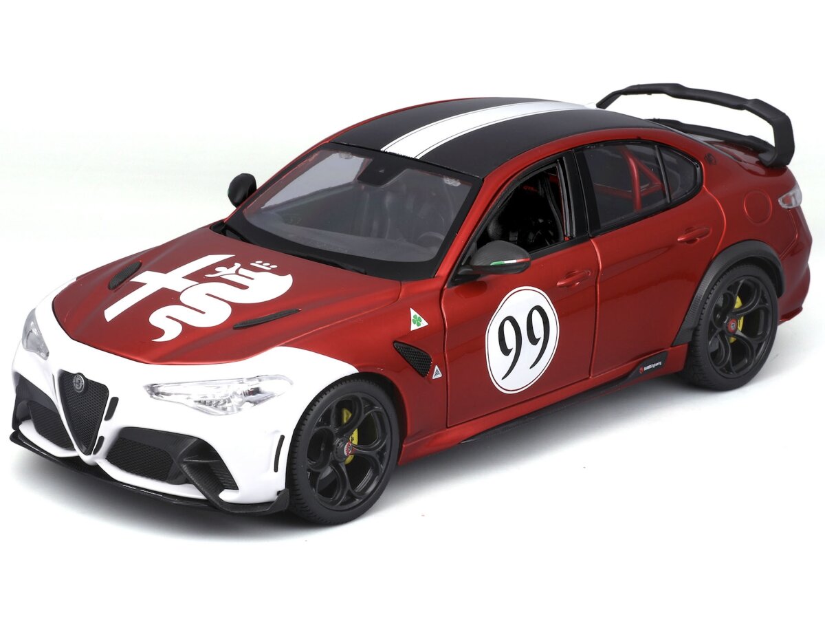 Gedetailleerd schaalmodel van de Alfa Romeo Giulia Gtam #99 Racing 2020 in schaal 1:18 en kleur rood/wit/zwart.