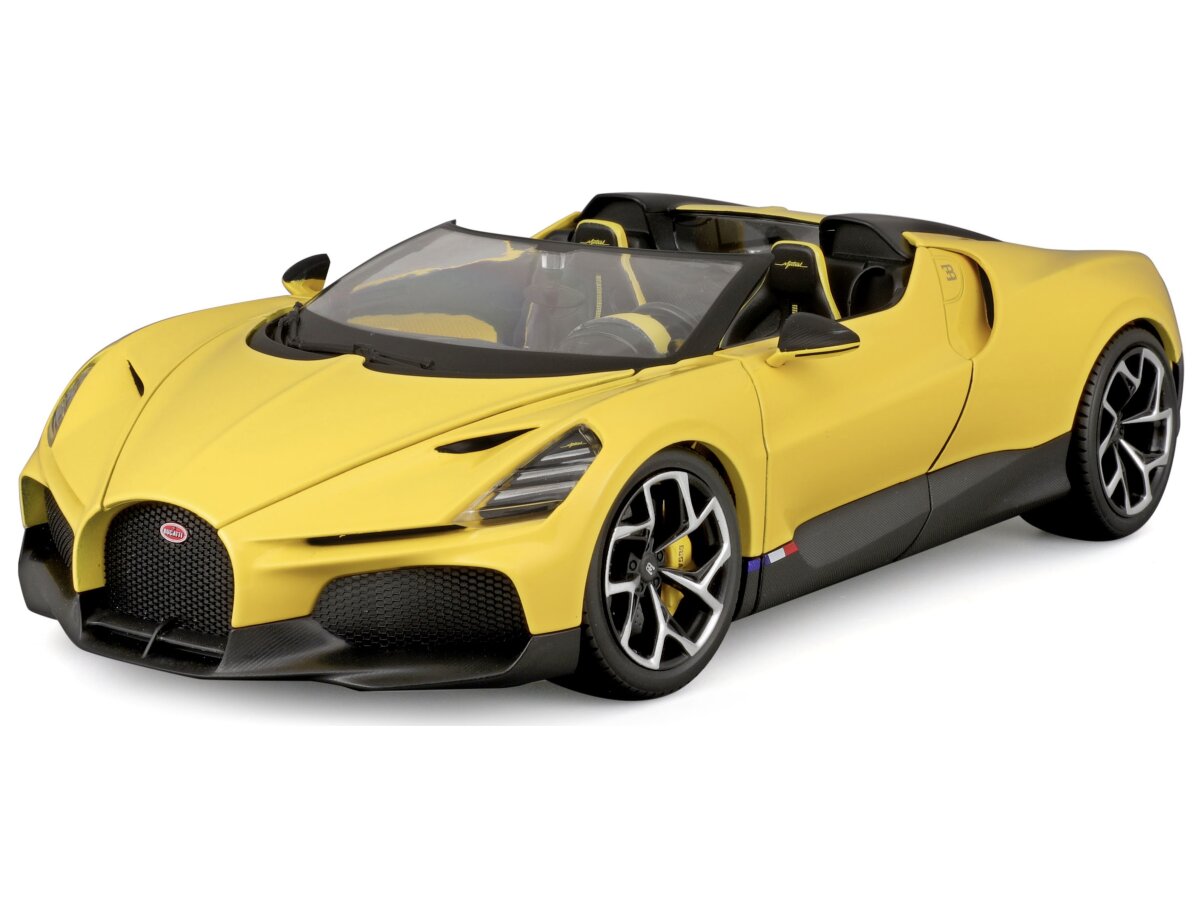 Gedetailleerd schaalmodel van de Bugatti W16 Mistral Cabriolet in schaal 1:18 en kleur geel/zwart.