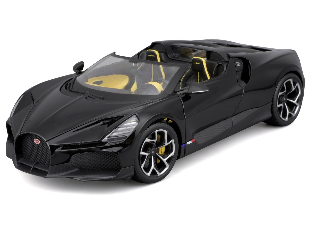 Gedetailleerd schaalmodel van de Bugatti W16 Mistral Cabriolet (eurasia Version) in schaal 1:18 en kleur zwart.