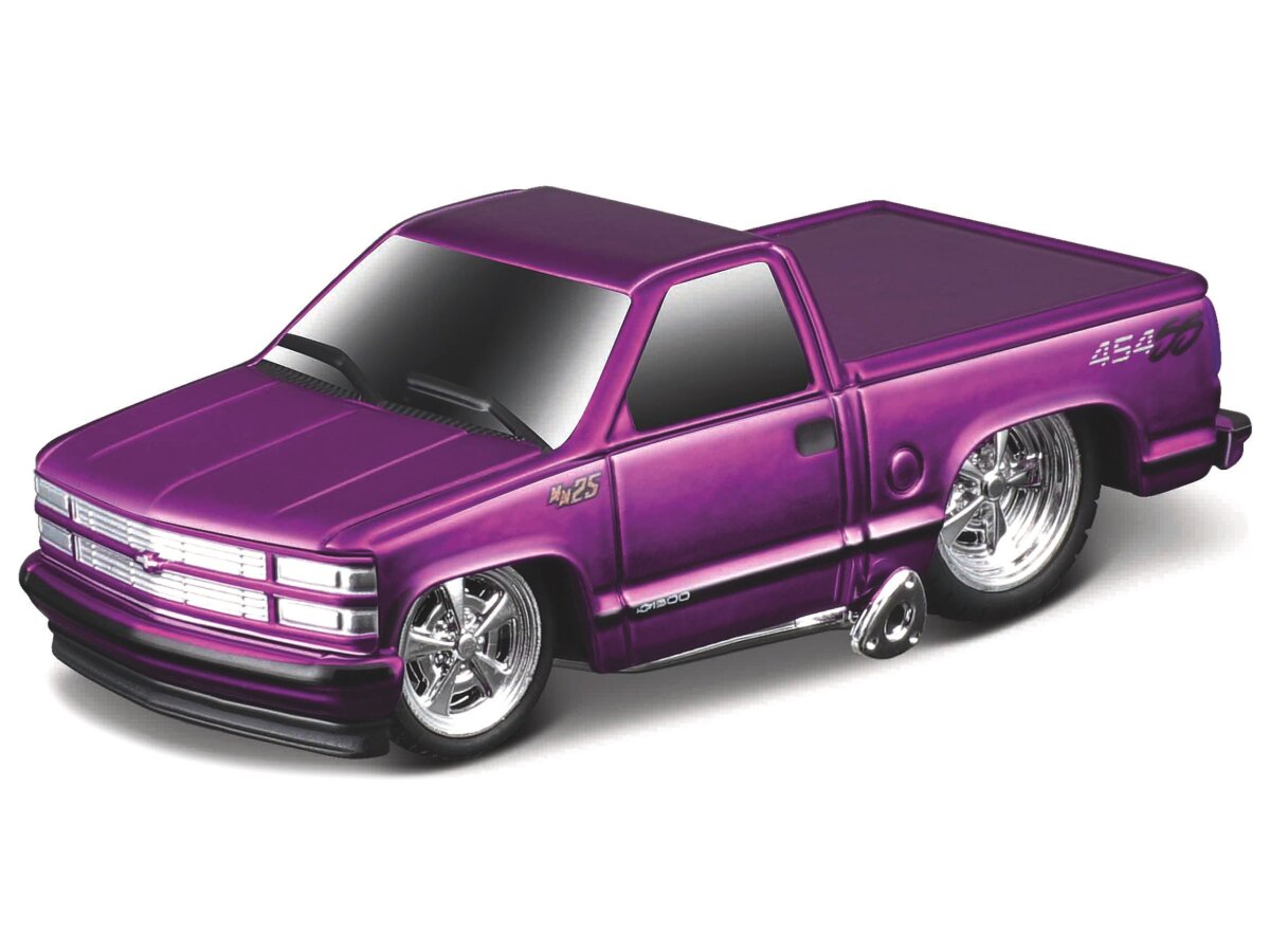 Gedetailleerd schaalmodel van de Chevrolet 454 Ss Pickup 1995 (muscles Machines) in schaal 1:64 en kleur paars metalic.