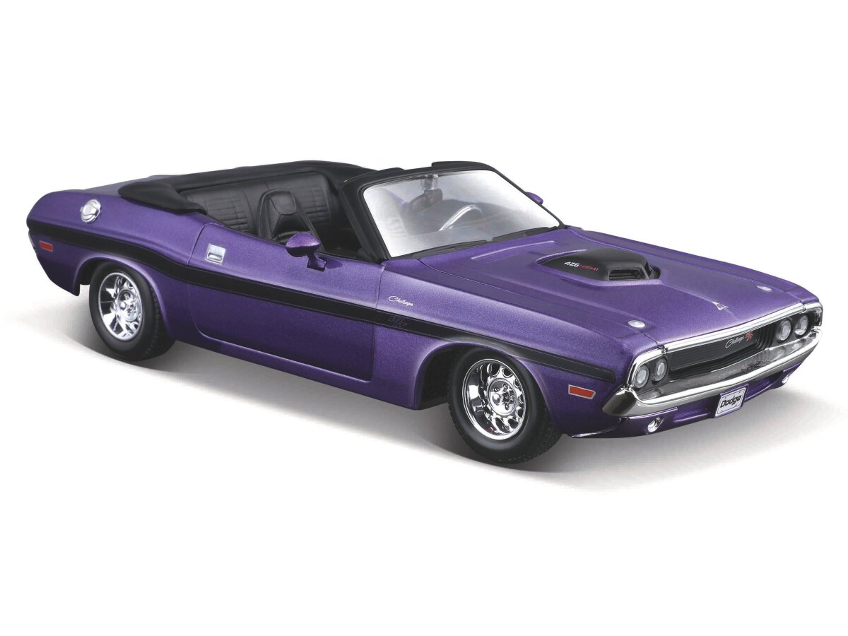 Gedetailleerd schaalmodel van de Dodge Challenger R/t Convertible 1970 in schaal 1:24 en kleur paars.
