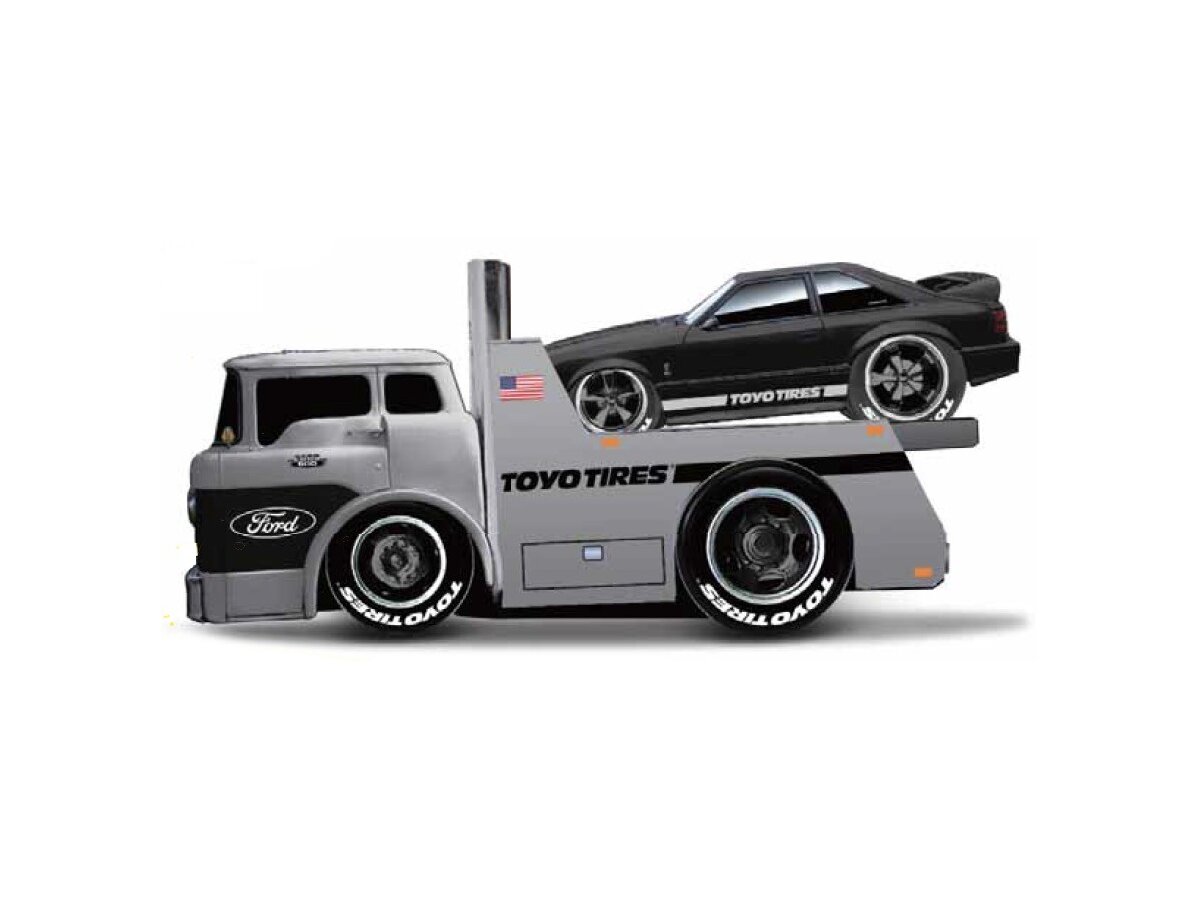 Gedetailleerd schaalmodel van de Ford C600 Flatbed 1966 + Ford Mustang Svt Cobra 1993 in schaal 1:64 en kleur zilver/zwart.