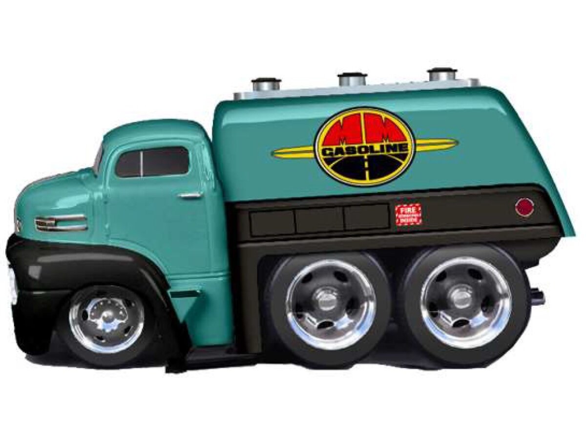 Gedetailleerd schaalmodel van de Ford Coe Fuel Truck 1950 in schaal 1:64 en kleur turquoise/zwart.
