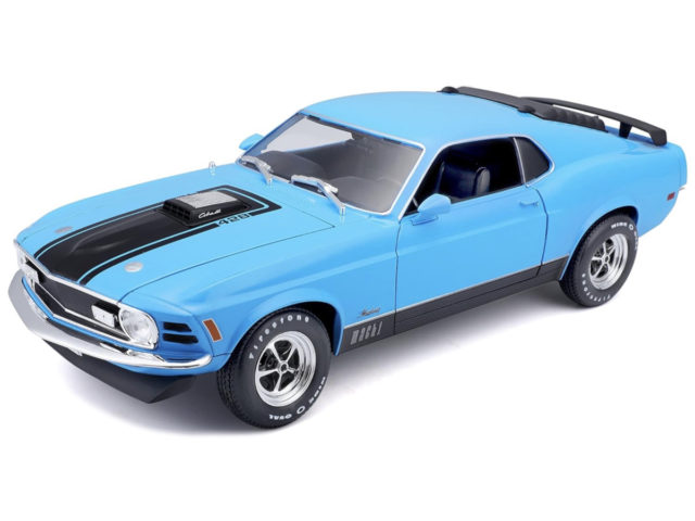 Gedetailleerd schaalmodel van de Ford Mustang Mach 1 1970 in schaal 1:18 en kleur blauw/zwart.