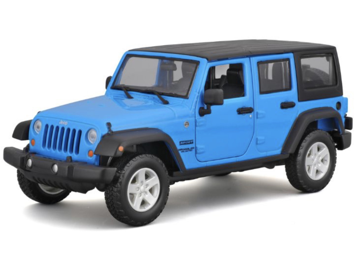 Gedetailleerd schaalmodel van de Jeep Wrangler Unlimited 2015 in schaal 1:24 en kleur blauw.
