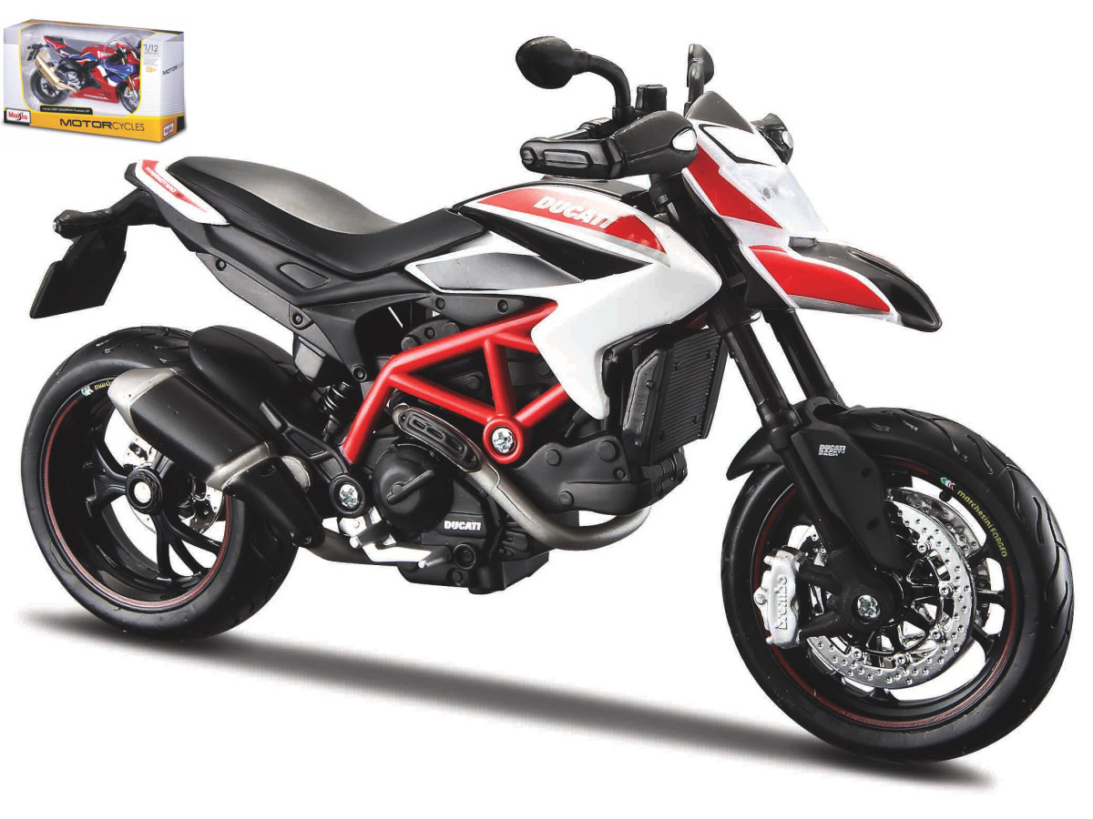 Gedetailleerd schaalmodel van MAISTO van de Ducati Hypermotard Sp 2013 in schaal 1:12 en kleur wit/rood/zwart.