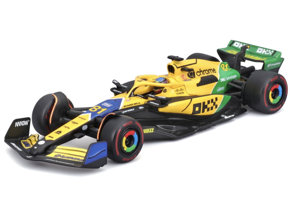 Gedetailleerd schaalmodel van de Mclaren Mcl 38 #81 Oscar Piastri 2nd Monaco Gp – Senna 30th Anniversary Livery 2024 With Helmet in schaal 1:43 en kleur Geel/groen/blauw.