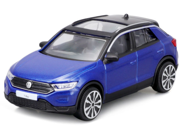 Gedetailleerd schaalmodel van de Vw T-roc 2021 in schaal 1:43 en kleur blauw metalic.