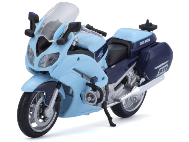 Gedetailleerd schaalmodel van de Yamaha Fjr 1300a ‘state Police’ Authority in schaal 1:18 en kleur licht blauw/blauw.